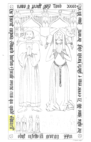 1524 the 24th of Aprill, dyscessyd master Edward Burtoon, gentil’, and lyethe buryed in St. Chadd’s churche within St. Gorgys chappell there.” Longnor, or as it is sometimes written, Longner, at which this gentleman was seated, is an insulated part of St. Chad’s parish: and Mr. Burton’s tomb continued in this church till its fall when it was removed to Atcham. It is a flat alabaster stone, engraved with the figures of a man in a long gown with wide sleeves, and a woman in pointed head-dress, lying in the act of prayer under two Gothick tabernacles: with three shields; that over his head bearing, per pale, B. and G. a cross engrailed O. between 4 roses A. Burton 2; that over her’s, O. on a bend S. 3 trefoils slipped A., impaling A. a lion rampant S.3, the centre one, probably once containing their joint arms, defaced. Under their feet the effigies of seven daughters*: and this inscription : Hic jacent corpora Edwardi Burton & Jocose uxoris ejus qui quidem Edward’ obiit in festo ‘c’i georgii prili die aprilis anno d’ni M ccccc xxiiii & p’dicta Docosa obiit die mensis ccccc quor’ aiab’ p’piciet’ d’ amen.